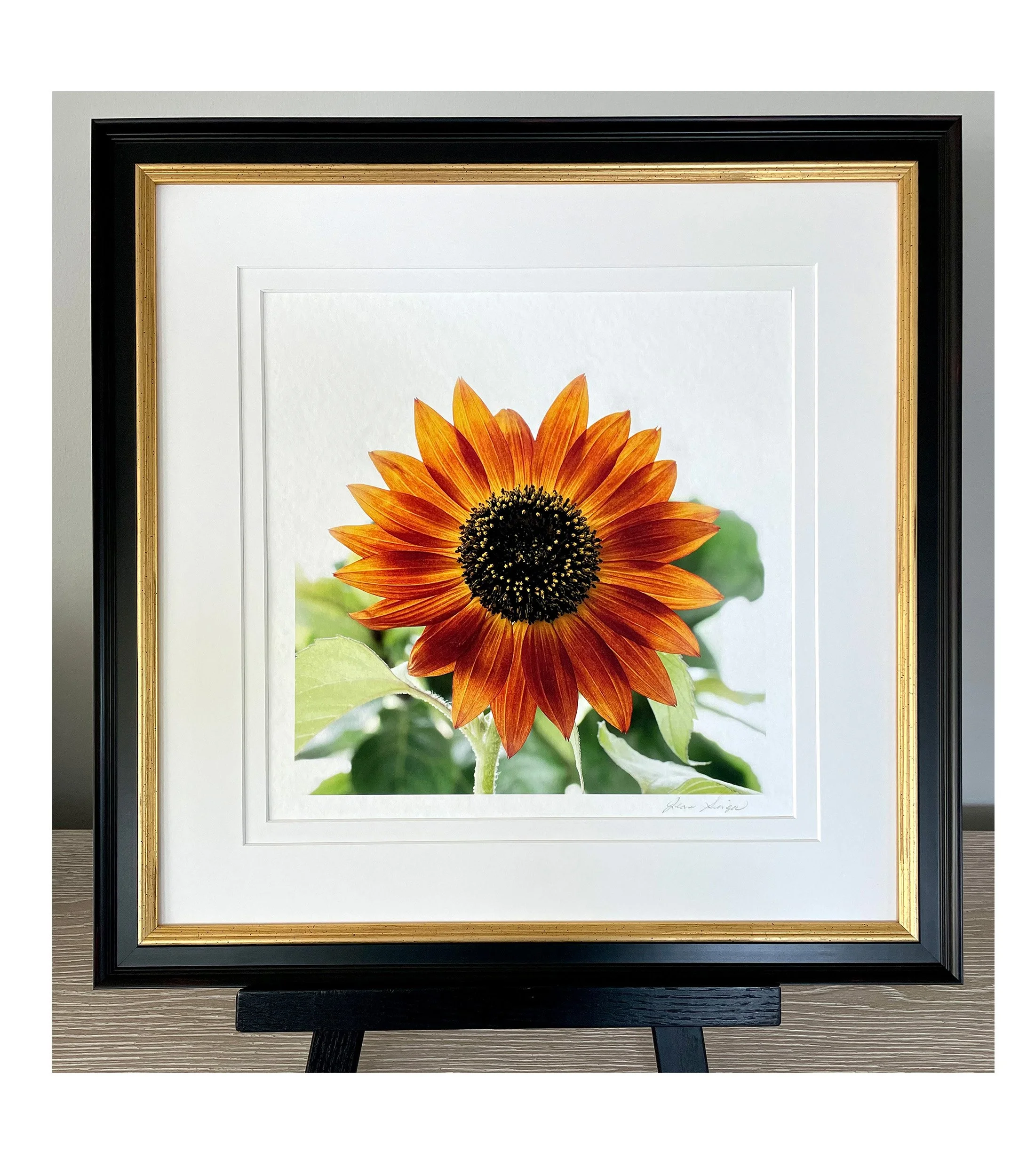A matted and framed fine art print of a sunflower in the field. 16”x16”